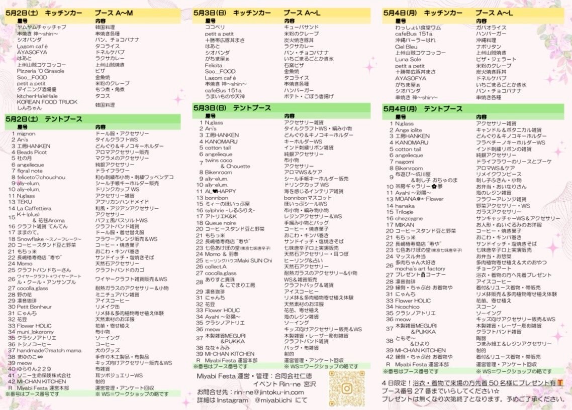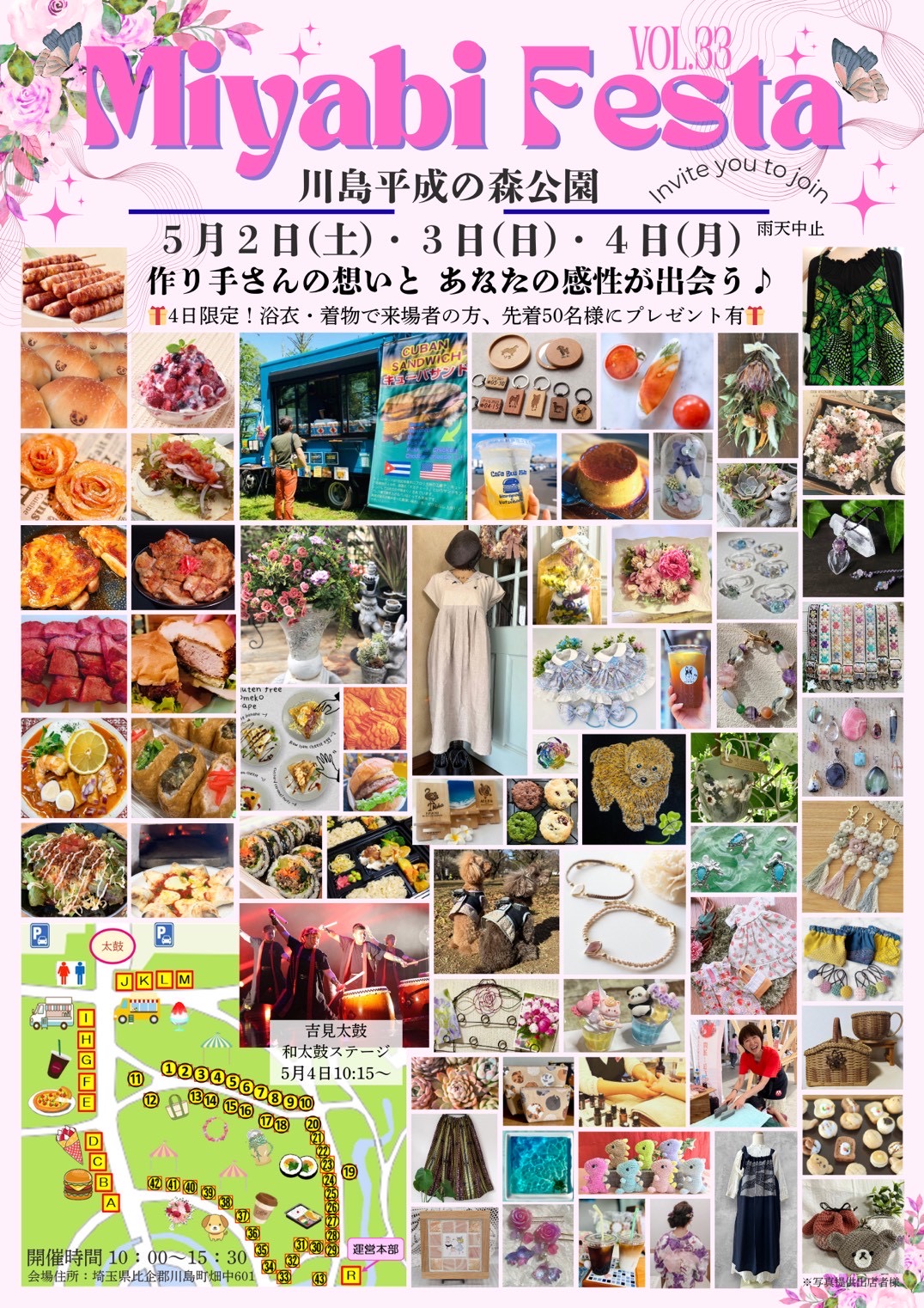 2026年5月2日(土)・3日(日)・4日(月)に川島町の平成の森公園にて第33回Miyabi Festaを開催いたします。出店者はこちらの→出店者一覧表からご覧ください。出店エリアはこちらの→ブースマップからご覧いただけます。