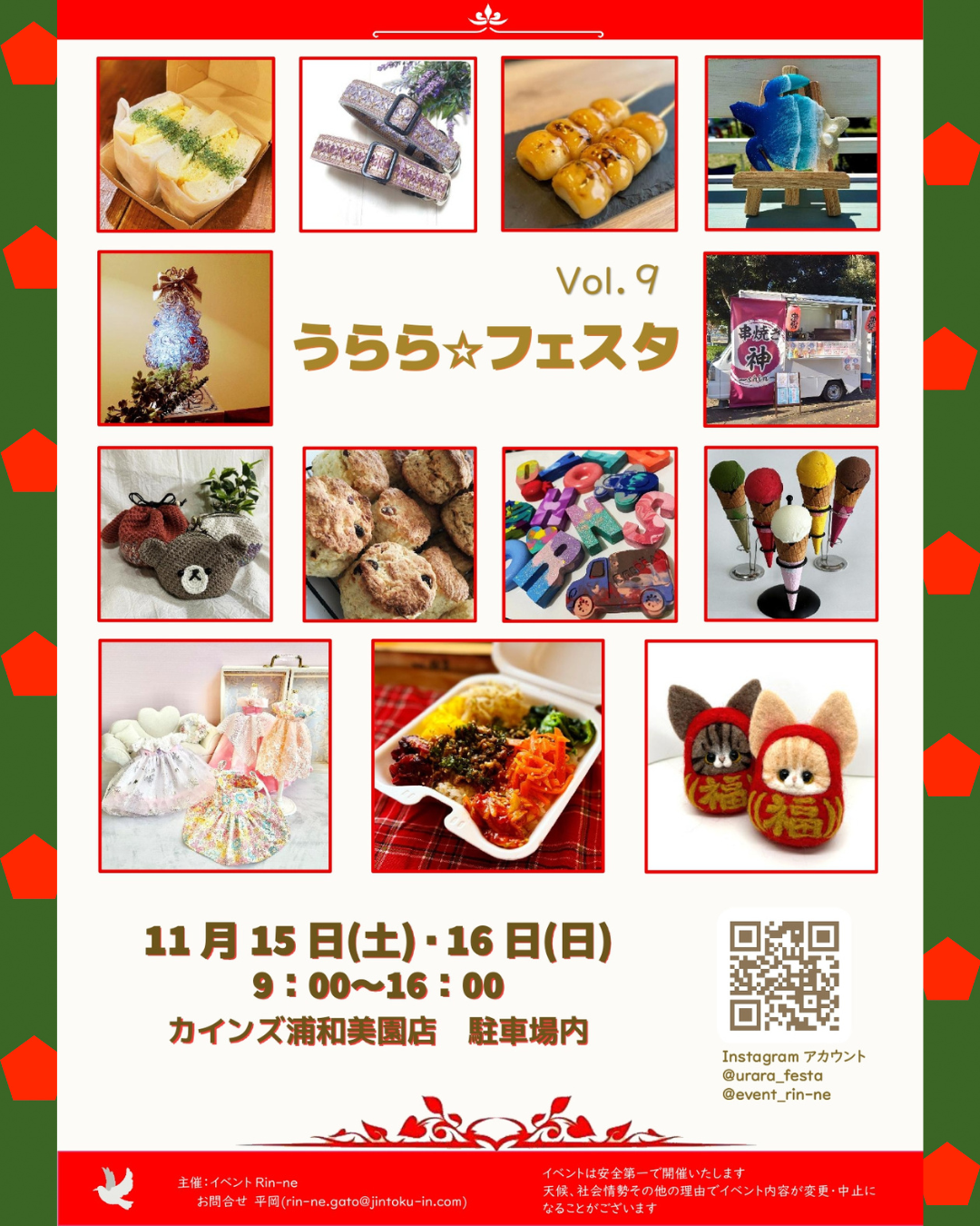 2025年11月15日(土)・16日(日)に第9回うららフェスタをカインズ浦和美園店で開催いたします。出店者はこちらの→出店者一覧表をご覧ください。
