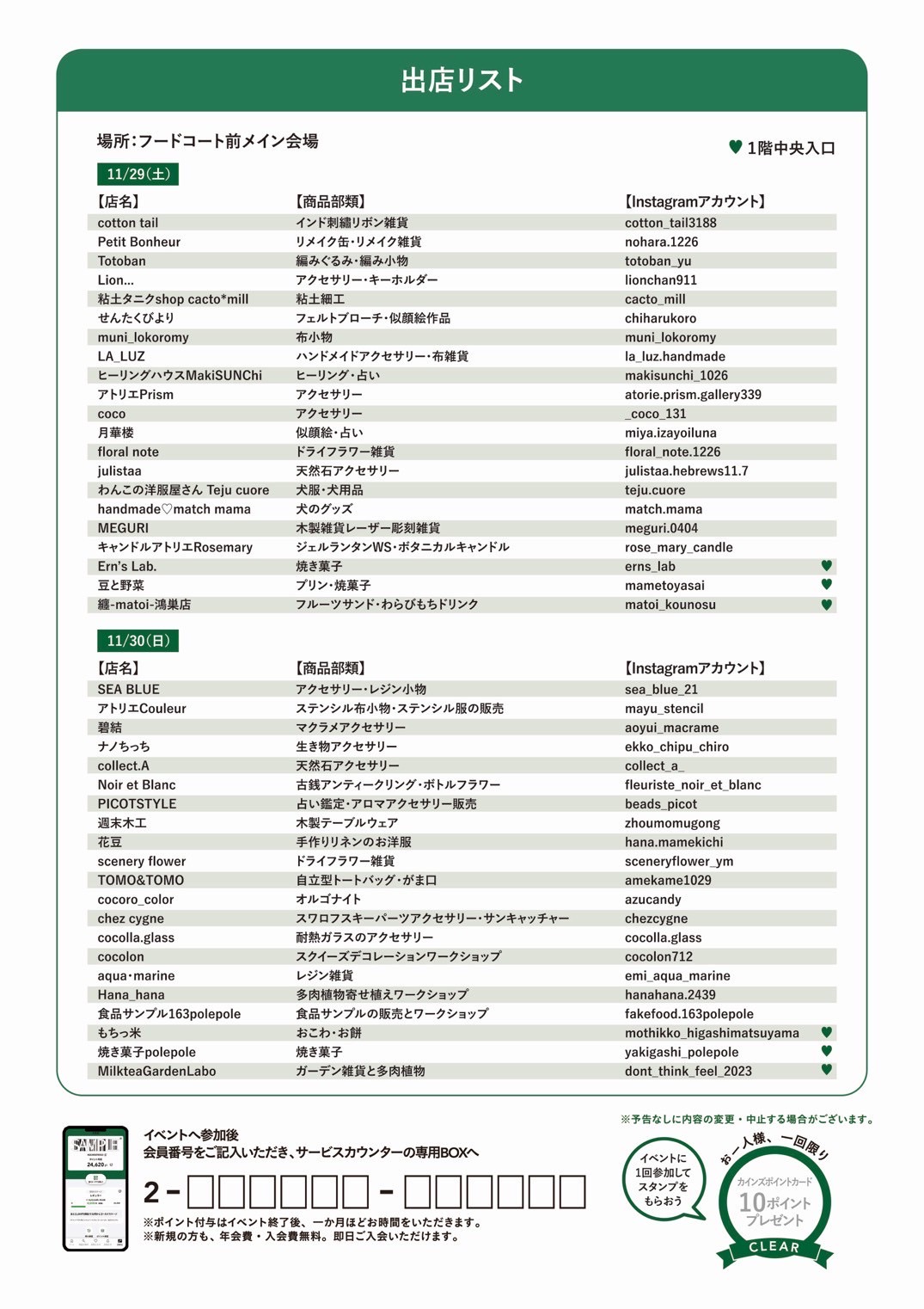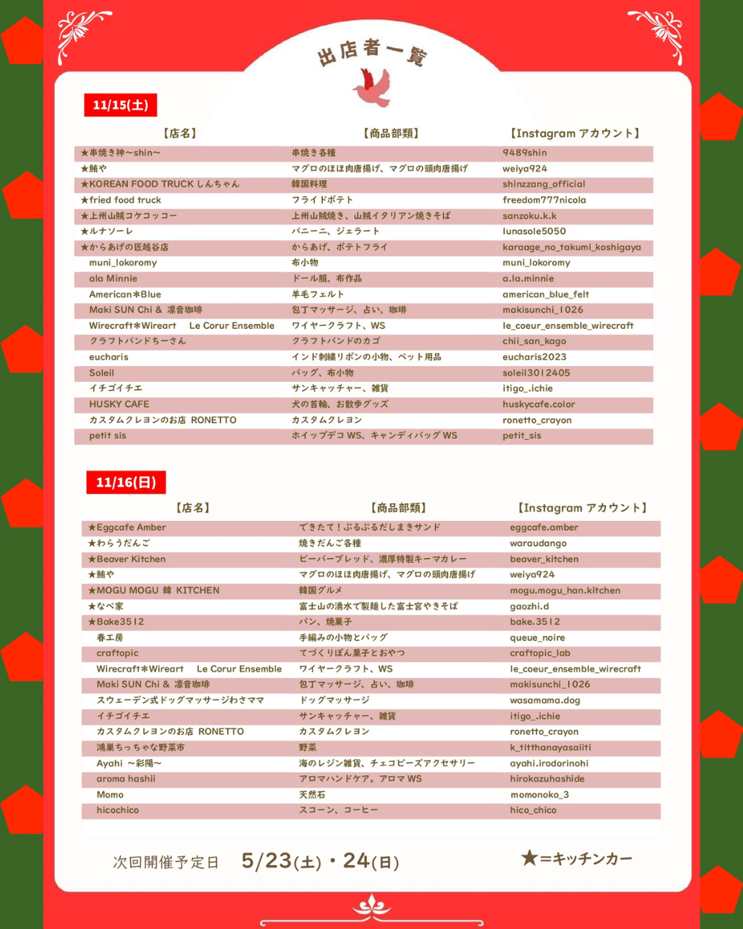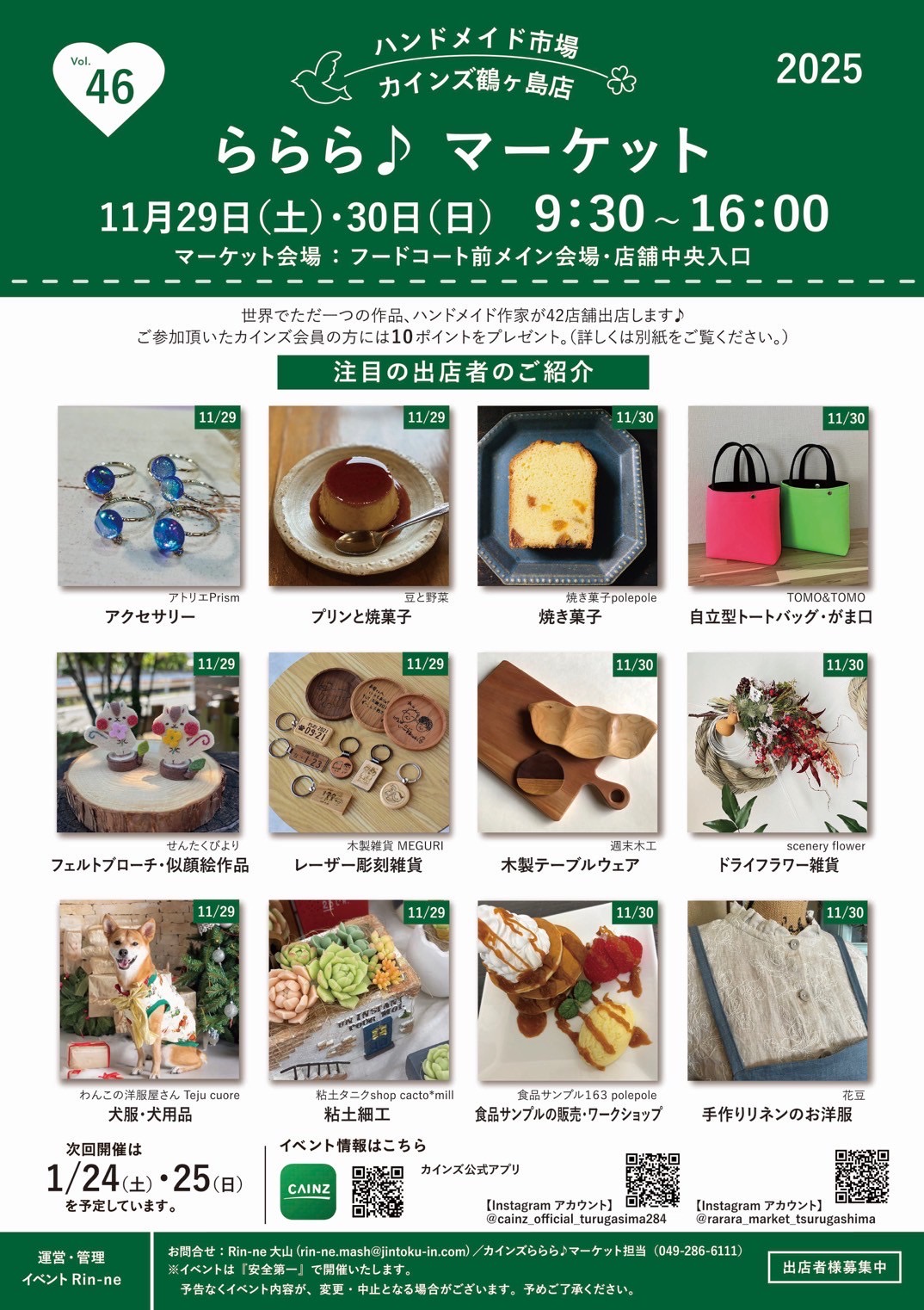 2025年11月29日(土)・30日(日)に第46回らららマーケットをカインズ鶴ヶ島店で開催いたします。出店者はこちらの→出店者一覧表をご覧ください。